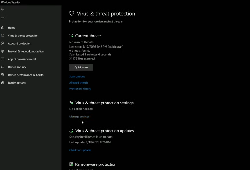 Go to Manage Settings under ‘Virus & threat protection settings.