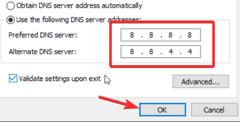 Now, you will see an option to select the option for Use the following DNS server addresses and enter the following for Preferred DNS Server and Alternate DNS Server. These are the numbers you need to put in: