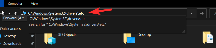 Press Windows+E to launch the File Explorer. Once the File Explorer is open, type/paste C:\Windows\System32\drivers\etc.