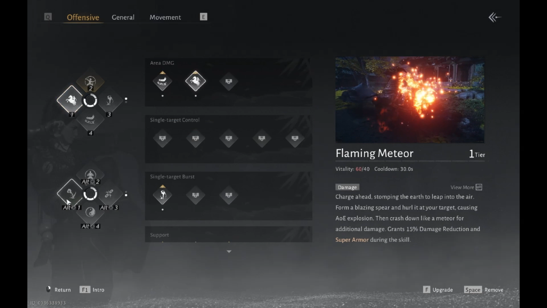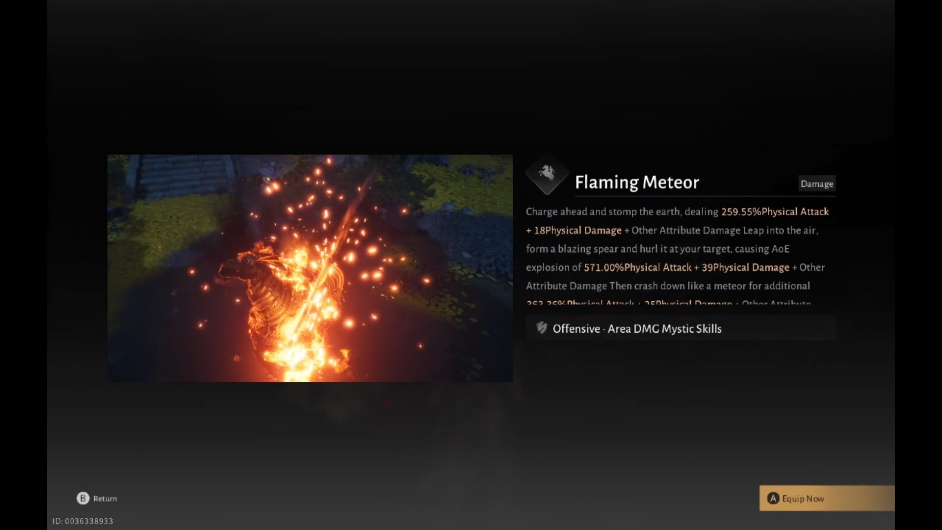 Flaming Meteor is an Offensive Area Damage mystic skill that allows your character to leap into the air, forge a blazing spear, and crash down like a meteor. It deals high physical and attribute damage in multiple stages while granting Super Armor and damage reduction.