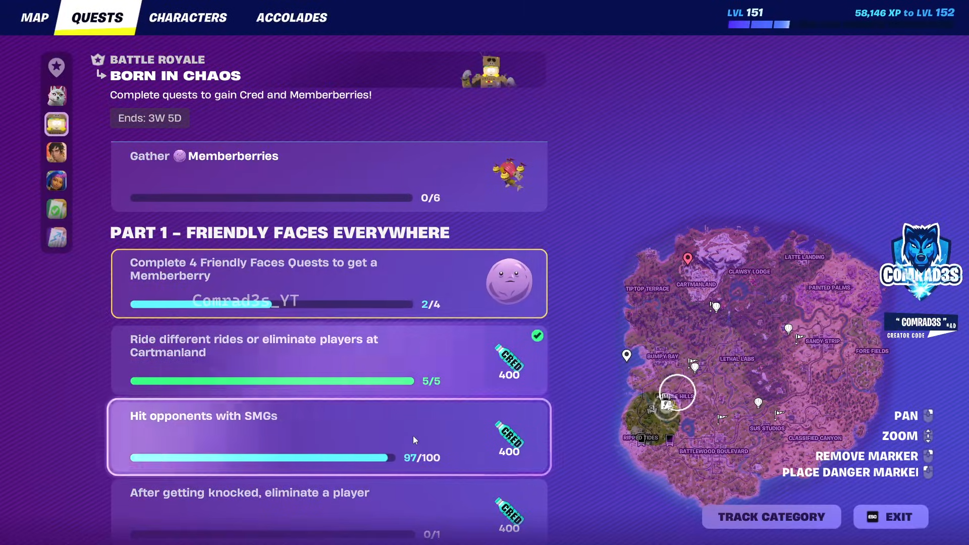 Progress with CRED unlocks South Park-themed cosmetics—no V-Bucks needed, though 1,800 V-Bucks skips tiers later. Collect 6 Memberberries from quest parts for the Imaginationland Airship Glider. Other Part 1 quests like riding at Cartmanland pair well for multi-progress.