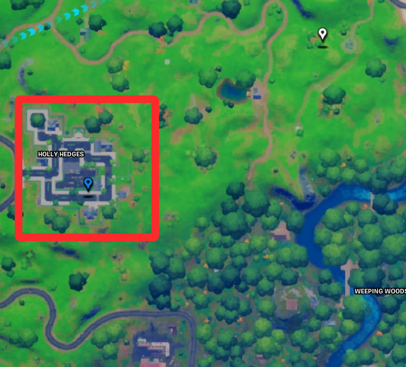 When you get dropped from the battle bus you need to maneuver your character towards Holly Hedges.