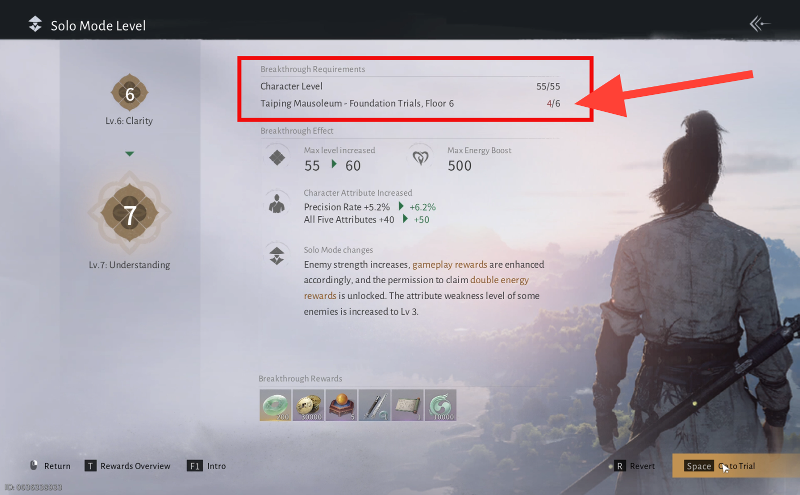 Solo Mode breakthroughs in Where Winds Meet tie specific Taiping Mausoleum Foundation Trials to character level thresholds, unlocking higher Solo Mode Levels upon completion.