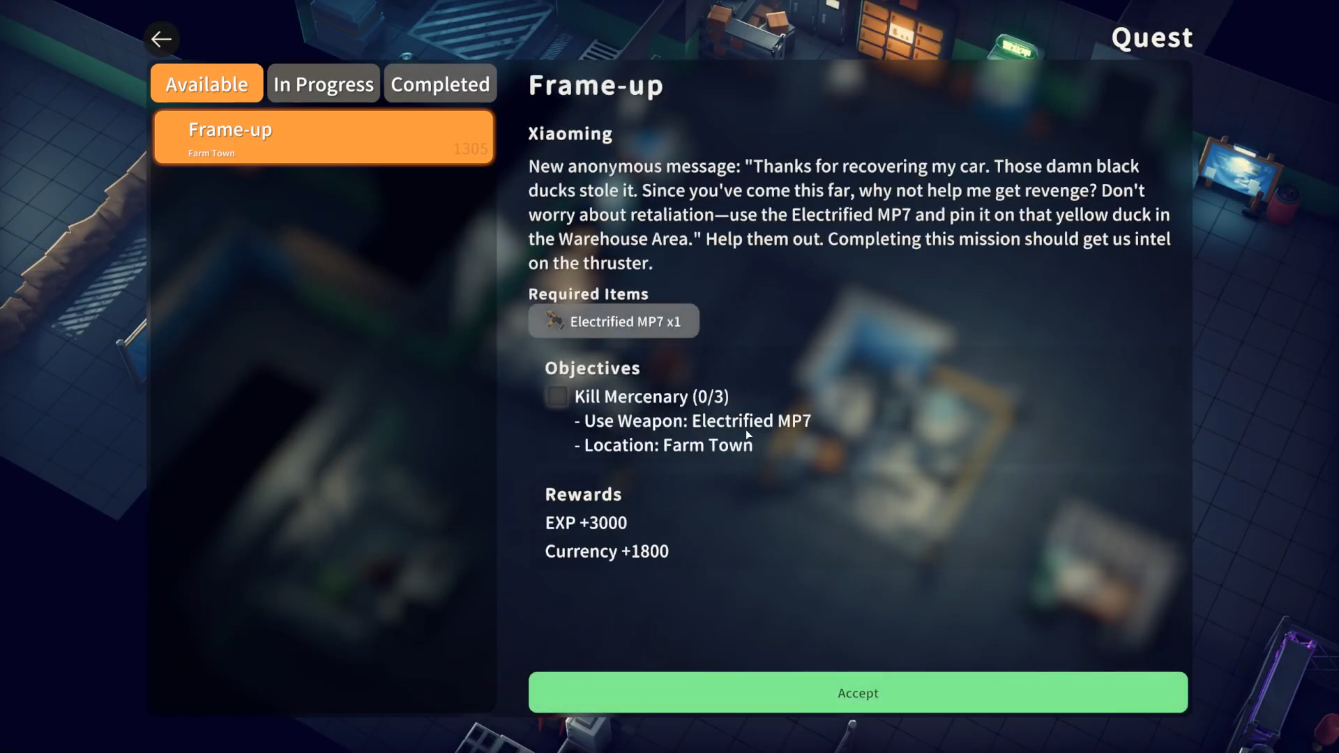 The quest Frame-up is given by Xiaoming in Farm Town. You’ll need an Electrified MP7 to complete this revenge mission. Completing it rewards XP and currency.