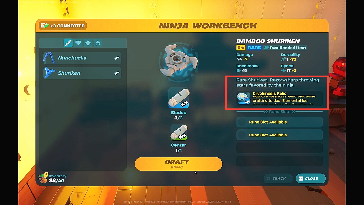 Move to the ninja workbench inside the temple and select a weapon. Select the resources as per the weapon you want to craft. Select Cryokinesis Relics in the Relics Slot. You can use the Ritual Altar to get the missing resources, like Honed Bamboo. After getting all the resources, click on Craft and hold to get the weapon, like Bamboo Shuriken.