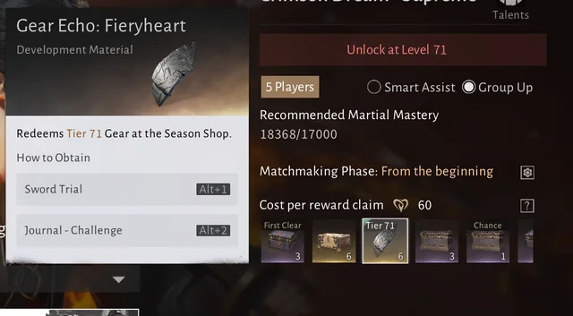 A Gear Echo reward typically corresponds to gear-level upgrades or gear-related materials — especially items tied to particular equipment paths such as Fieryheart (which is probably tied to a particular set or theme of gear).