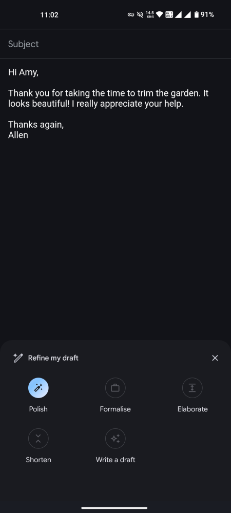 - The ‘Polish’ option can transform rough notes into refined, professional emails.