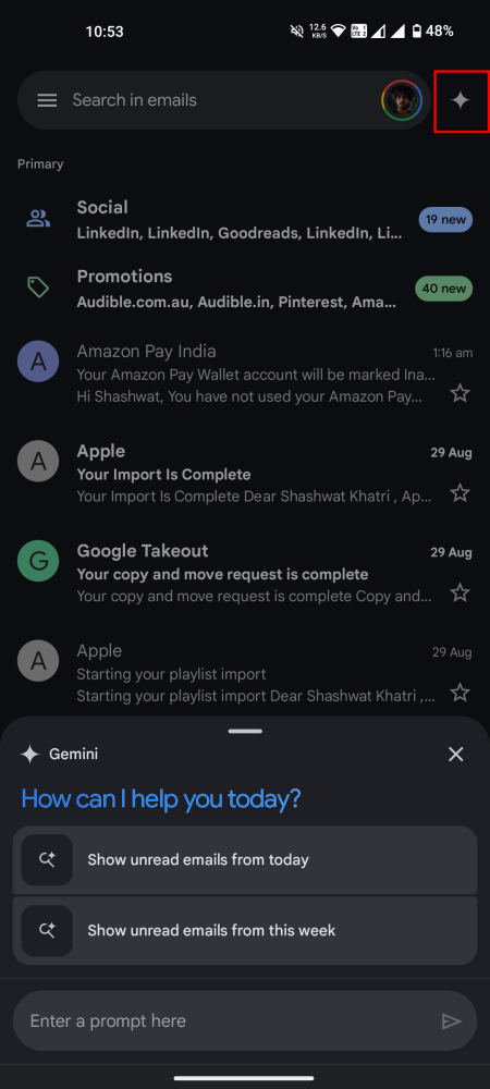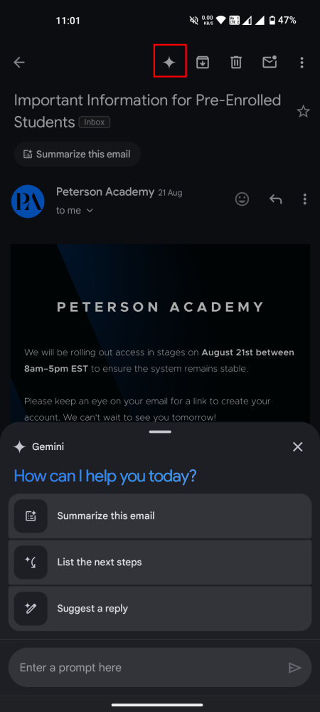 - Tap on the Gemini star at the top of the Gmail inbox or from within an email.