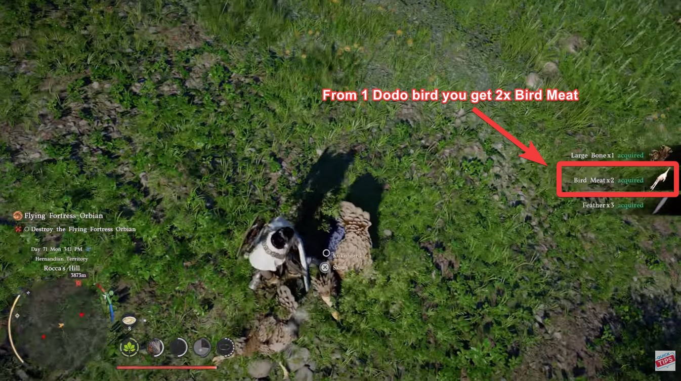 Meat farming becomes incredibly efficient once you reach the bird nest areas near Rocca Hills in the Hernand region. These dodo-like birds spawn in groups and have a unique behavior that works in your favor.