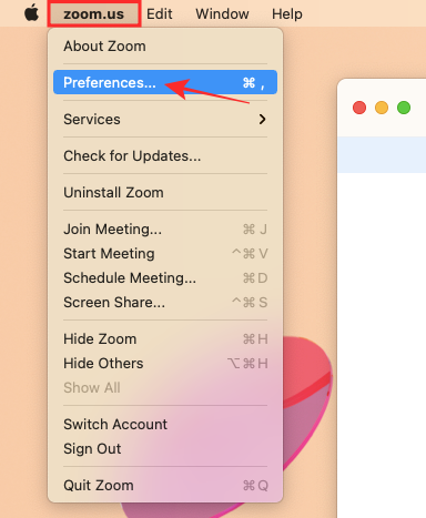 - On Mac: Clicking on Zoom in the menu bar and selecting ‘Preferences’.