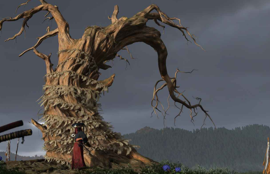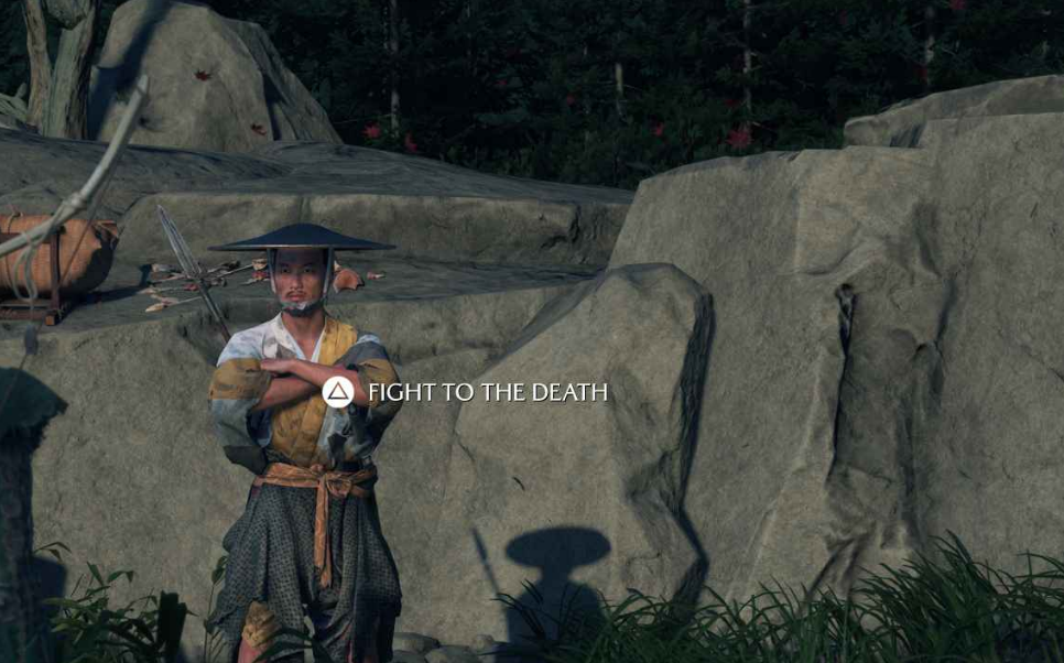 Approach the tree, accept the duel challenge, and defeat the ronin in one-on-one combat.
