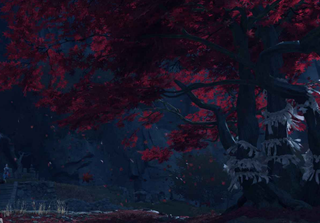 Among red-leafed trees in a quiet grove, a single dueling tree stands amid falling leaves. The beauty hides a fierce duel challenge from a roaming disciple.