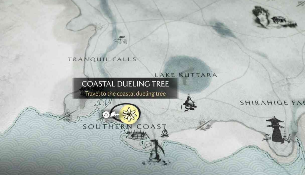 | Coastal Dueling Tree | Yotei Grasslands | Along the southern coast, southwest of Lake Kuttara, near Weary Traveller’s Camp | Takezo’s Dual Slash Technique, Straw Hat, and cosmetic kits |