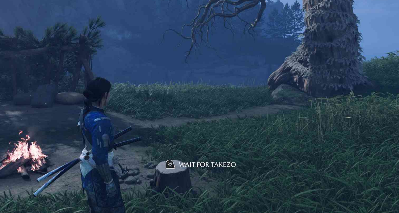 After clearing the first five duels, interact with the stump by the campfire to “wait for Takezo.” Follow him to the beach to begin the duel.