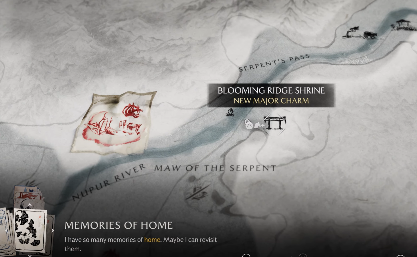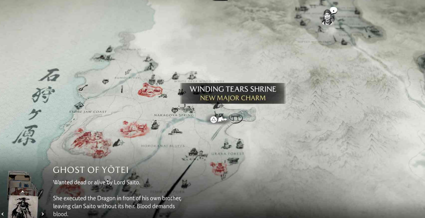 | Blooming Ridge Shrine | Yotei Grasslands | Climb cliffs near Nupur River | Charm of Amenowakahiko |