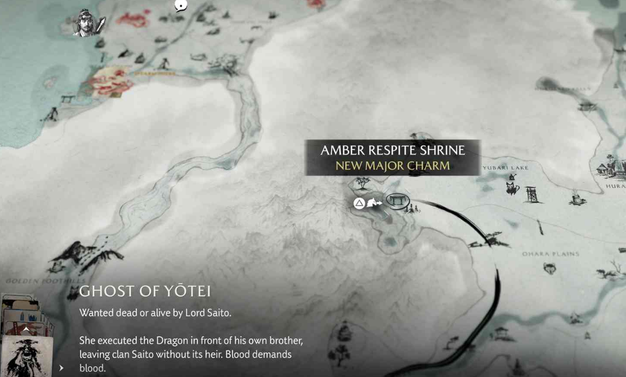 | Fall’s Rest Shrine | Yotei Grasslands | Look for torii gates on SE hill; basic platforming | Charm of Kanayago |