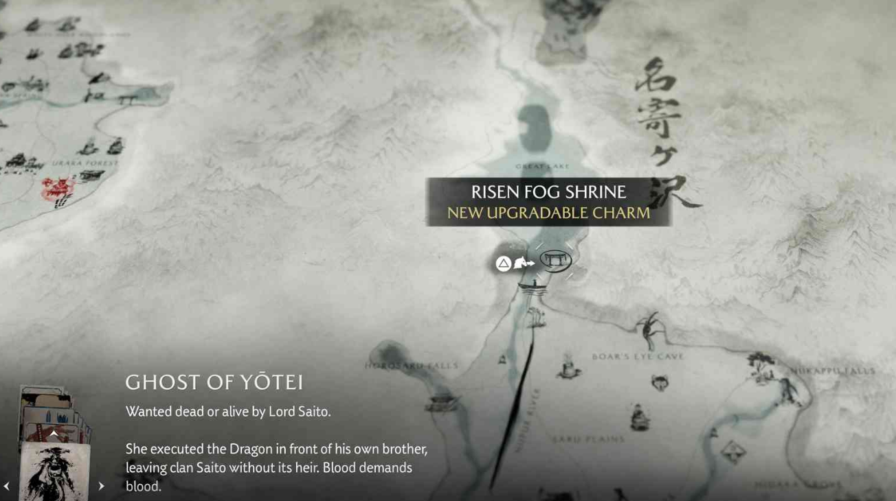 | Risen Fog Shrine | Tokachi Range | Northern ferry, follow north cliff path | Charm of Kibitsuhiko |