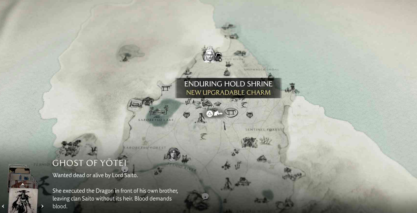 | Enduring Hold Shrine | Teshio Ridge | Remote cliffs, exposed ledges | Charm of Masaka |