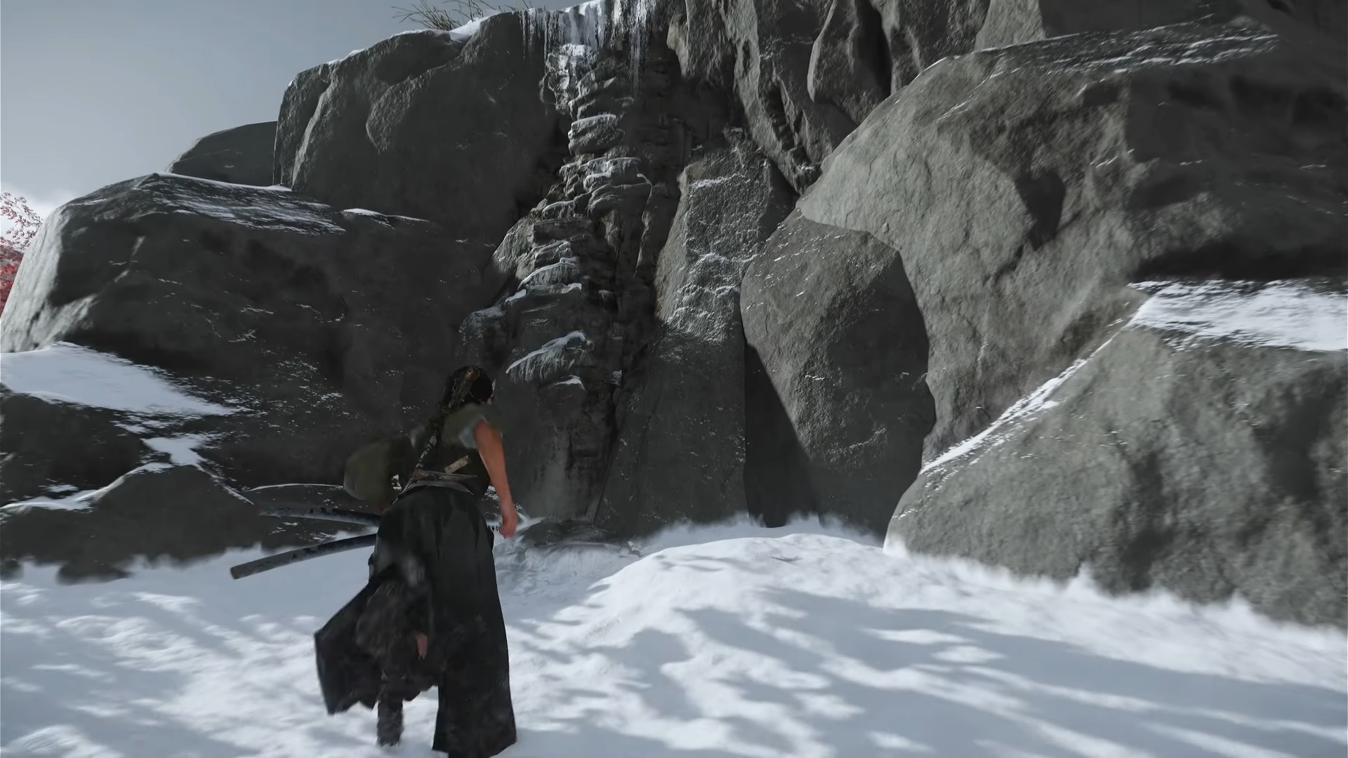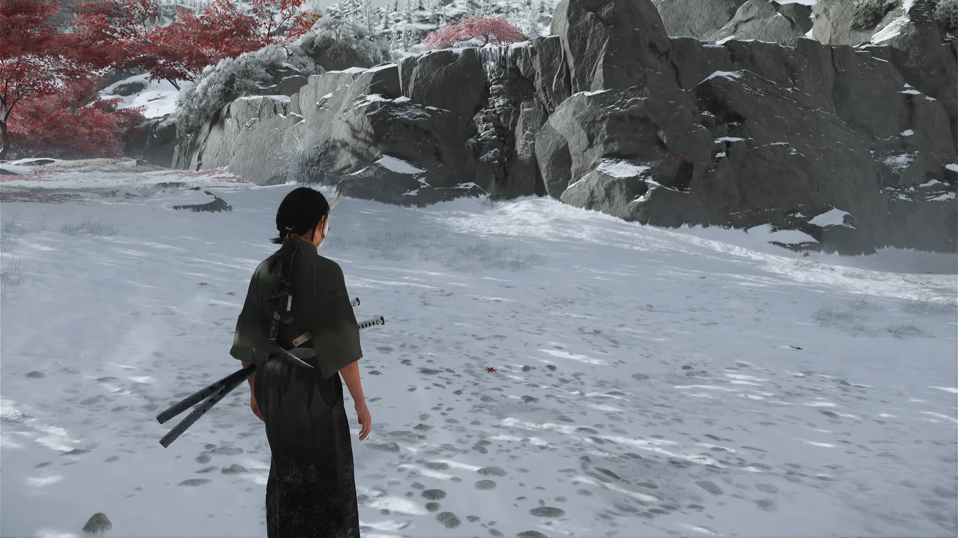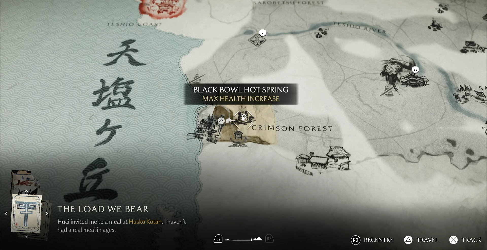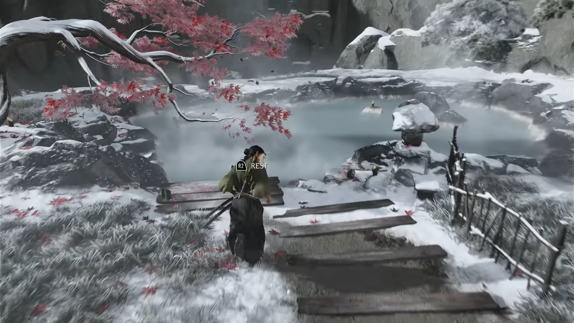 Ghost of Yotei's Black Bowl Hot Spring is positioned on the top of a cliff in the southwestern part of the Teshio Ridge. The general approach is to first reach the Red Crane Inn, then head west into the Crimson Forest area. Here, look for a prominent rock that can be climbed. The presence of snow and the cliff’s height are good visual cues.