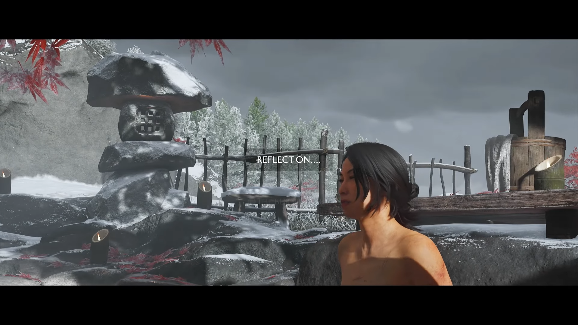 Approach the bucket next to the water and interact with it to initiate bathing. Atsu will relax in the hot spring and reflect on her journey.
