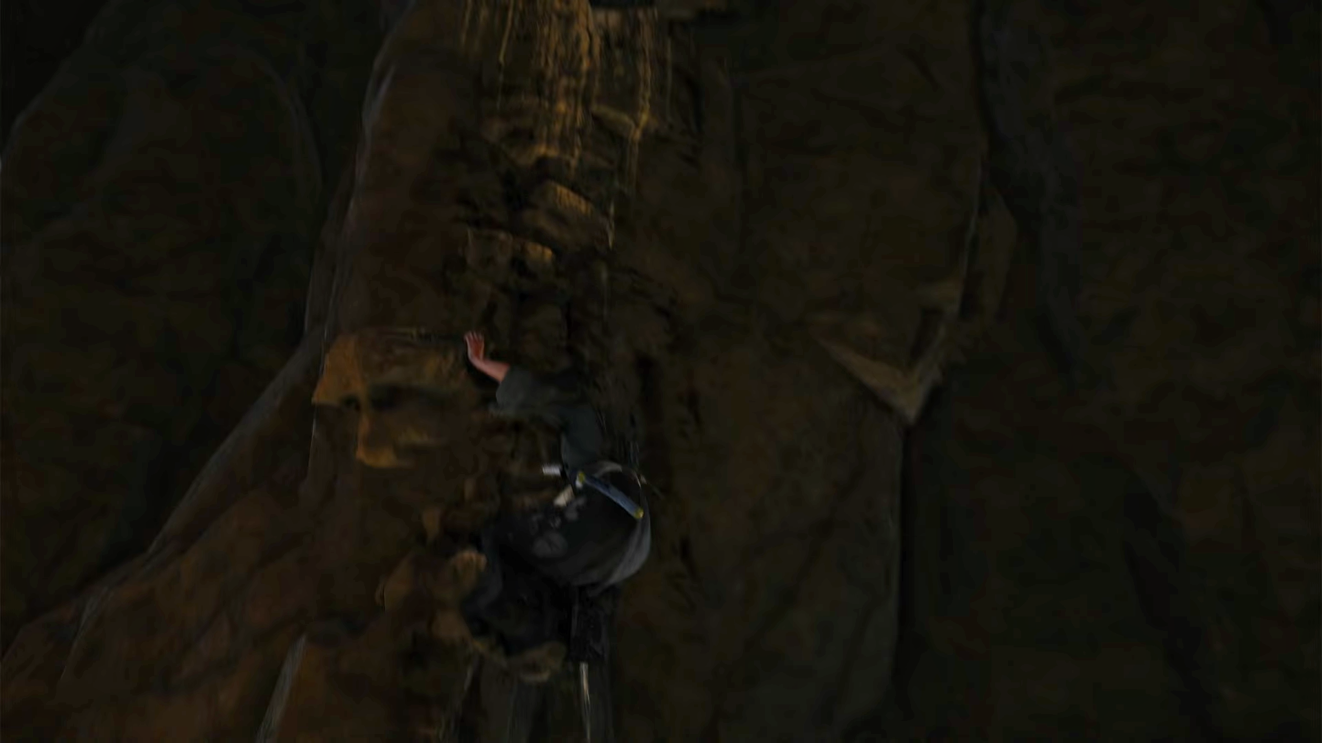 Utilize fixed handholds on the cliff walls to continue climbing upwards.