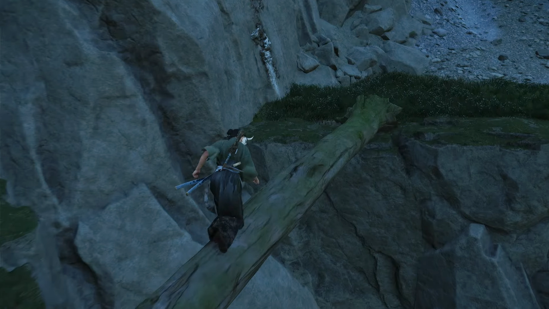 Balance and walk carefully across a log beam that bridges parts of the cliff path.