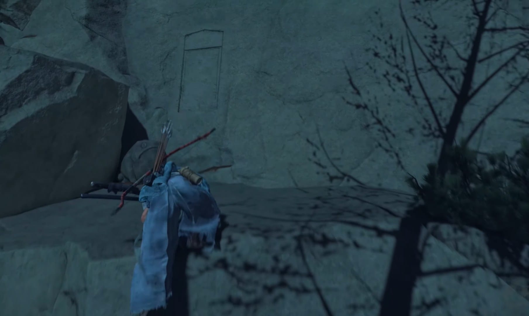 Scout the entrance to the Faithful Leap Shrine in the northwest Tokachi Range. Notice stone markers or banners indicating shrine pathways.