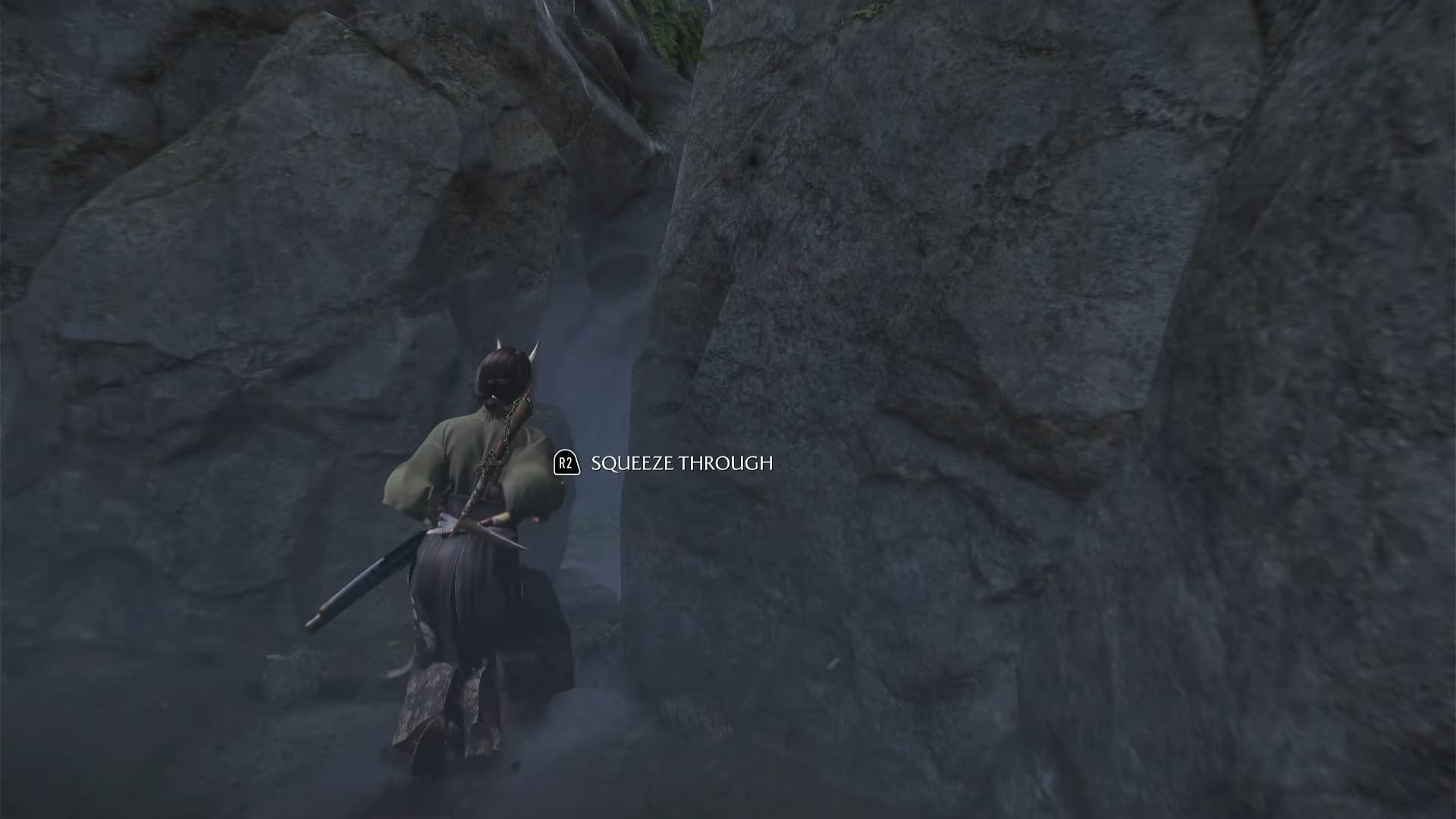 Approach the broken stone staircase to the tree’s left and squeeze through the narrow rock gap.