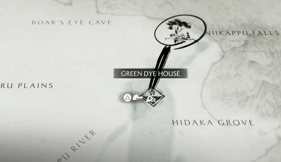 The Green Dye House is situated in the Tokachi Range, alongside the Niikappu River, and can be found near Kidaka Grove. Look for a hut marked by green lanterns and lotus flowers along the main woodland path. Access is unlocked after completing early Midori Woods quests and unlocking Hino Marshes through story progression.