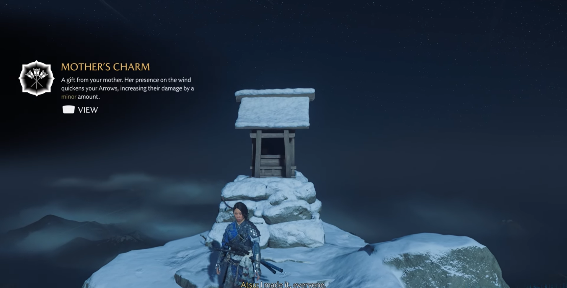 | Objective | Acquire your parents’ charms at the summit of Mount Yotei |