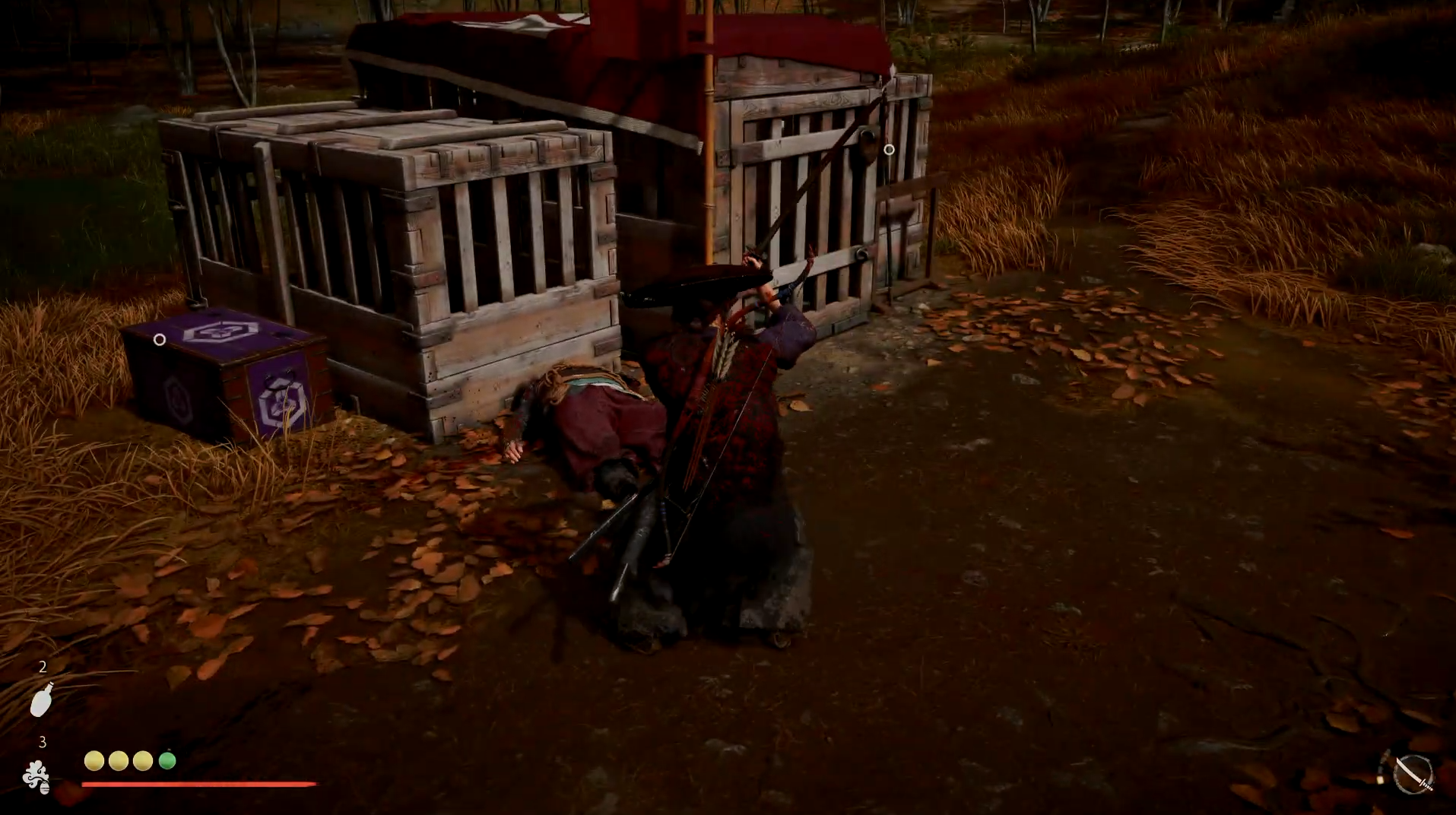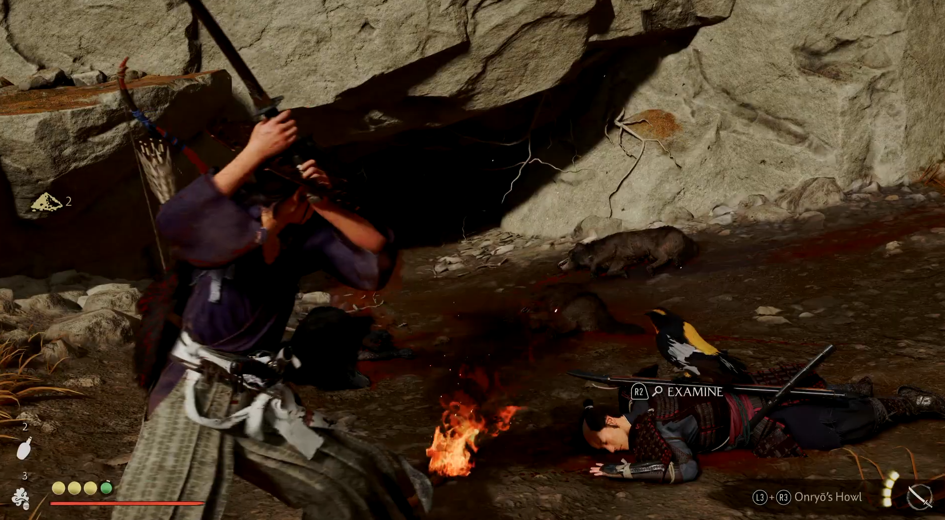 Arrive at a cliffside outpost with 6–8 enemies (archers, swordsmen, a naginata brute). Use stealth, grapple points, and vertical cover to your advantage. Free caged wolves mid-fight to gain combat support.