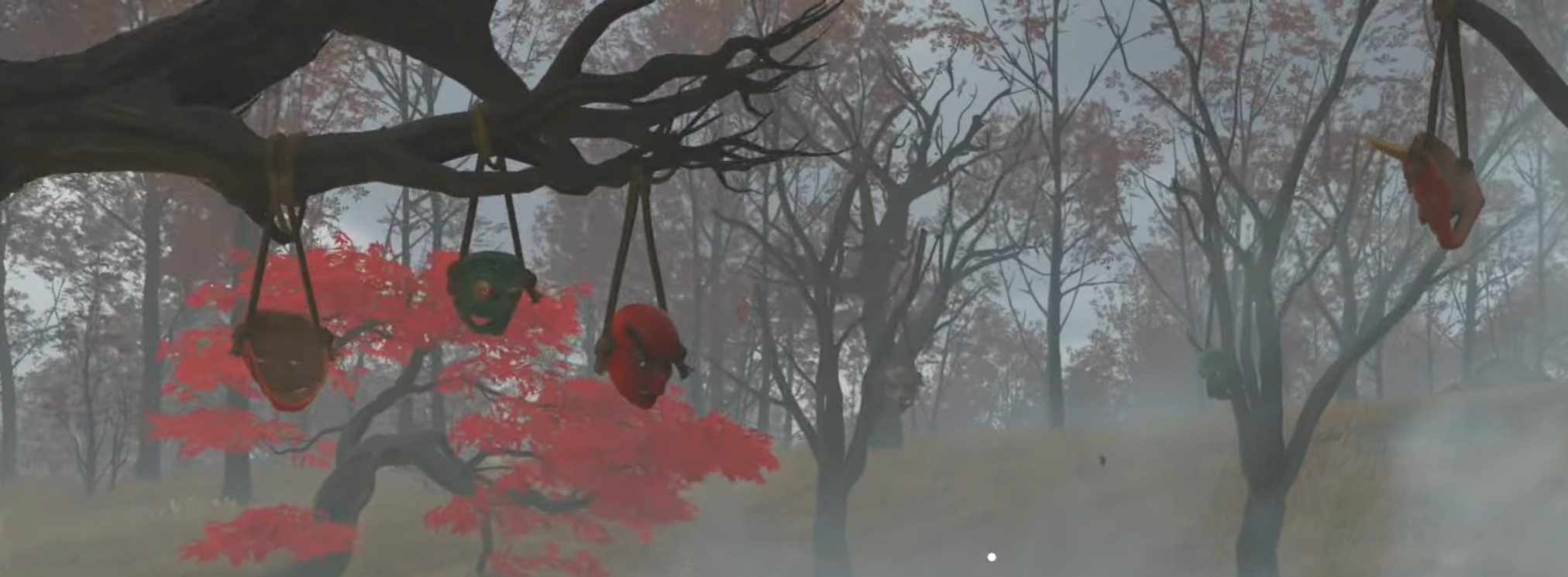 Head toward that tree. You’ll find wooden masks hanging from branches nearby—these are your key visual clues.