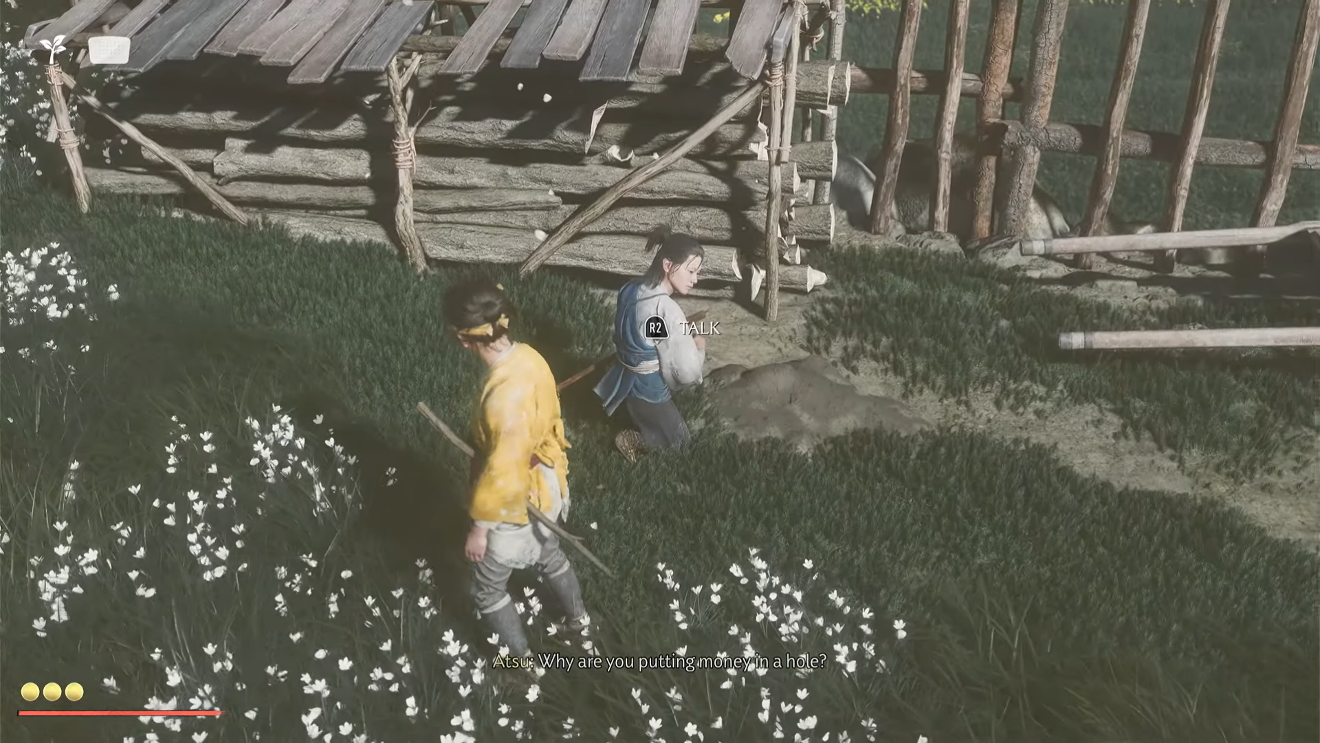 Move towards the gate, where young Atsu's brother, Jubei, is kneeling beside a hole. Interact to unlock the ability to dig up his hidden stash in the present.