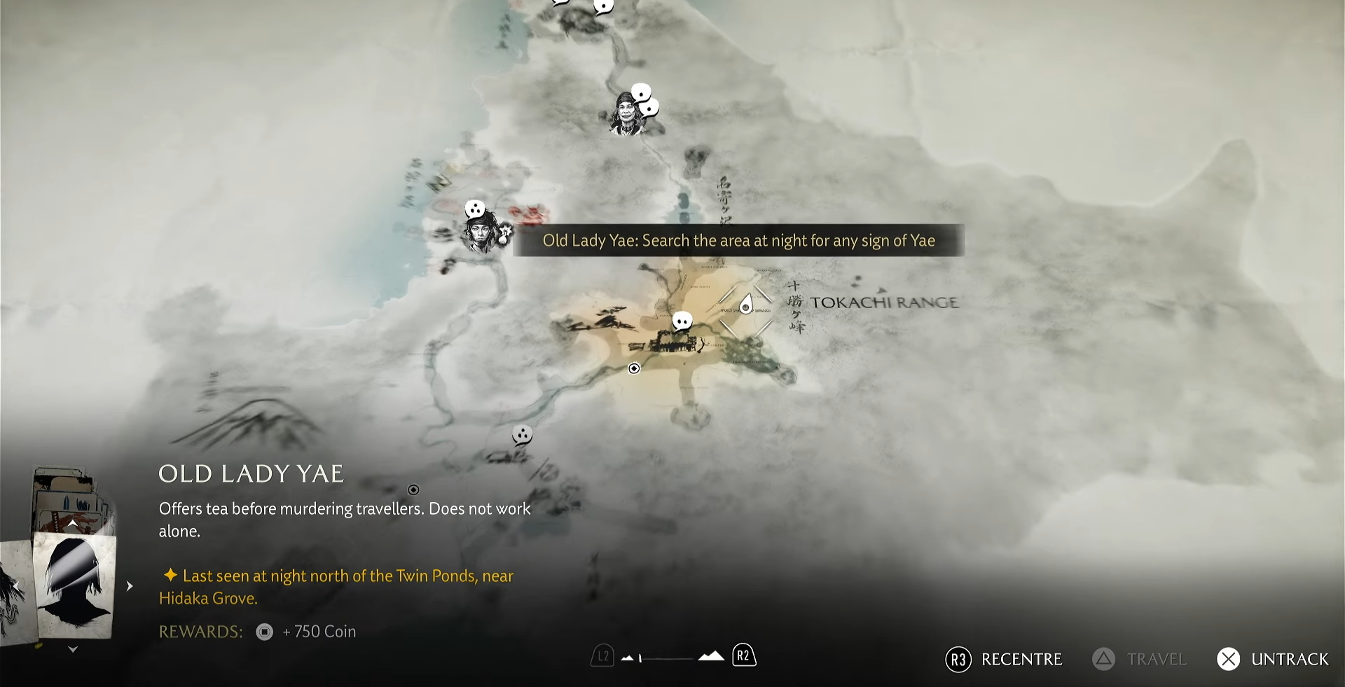 Old Lady Yae is a bounty in the Yotei Grasslands, typically north of Twin Ponds near Hidaka Grove. Approaching her, she initially appears as a seemingly benign old woman offering tea to travelers. However, this hospitality masks her true nature as a deadly adversary.