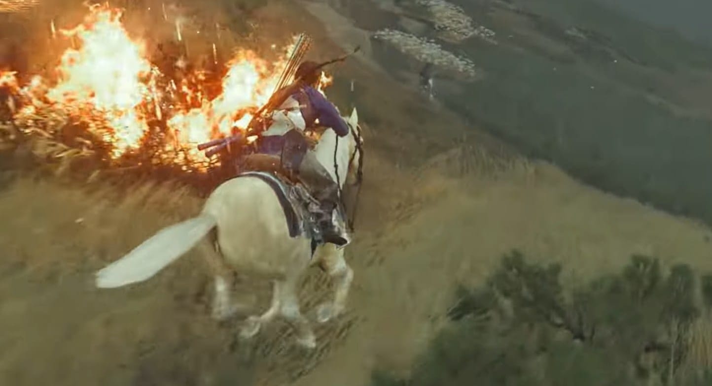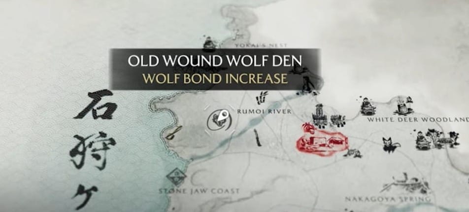 You’ll find the Old Wound Wolf Den near the dead tree west of the Rumoi River, beyond Stone Jaw Coast. Look for enemy Oni Raiders throwing fire bombs at the den—defeat them all to proceed.