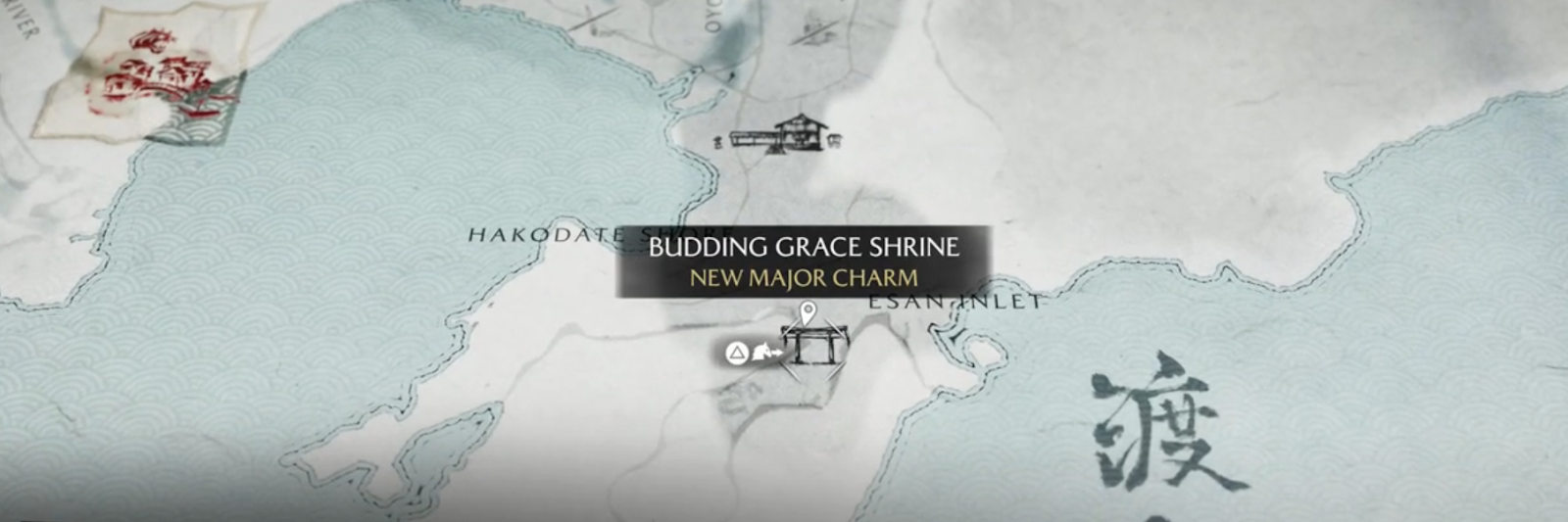 The Budding Grace Shrine is found on the eastern side of the Oshima Coast, at the very southern tip in the Esan Inlet. When exploring this coastal region, the shrine is marked by a series of torii gates that lead players uphill along the cliffside path. By following these gates, you will progressively ascend through long rope and bamboo climbs until you reach the shrine itself.