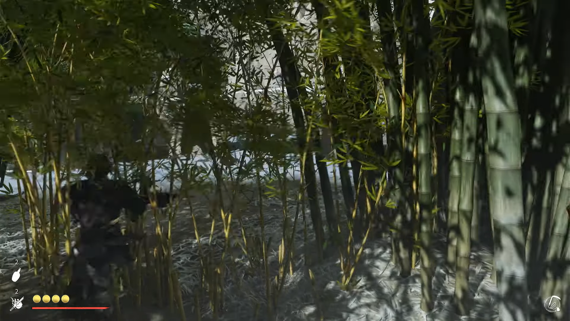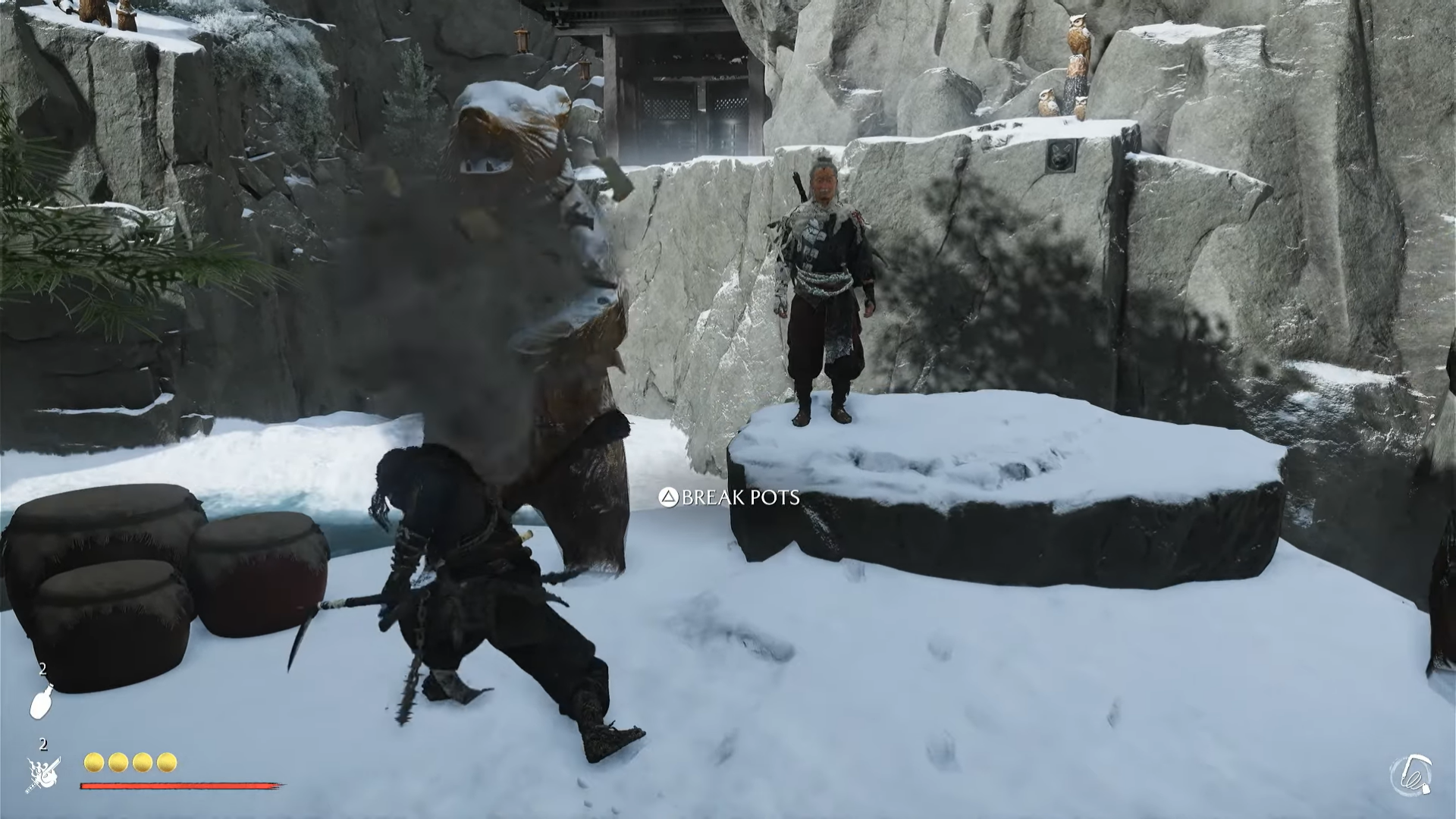 You’ll find bear statues holding vases behind the bamboo. Use charged heavy attacks with the Kusarigama (hold the heavy attack button) to smash vases — a single charged hit reliably destroys them and can reveal ropes or paths behind. If an enemy shield appears, break it first with a charged heavy attack.