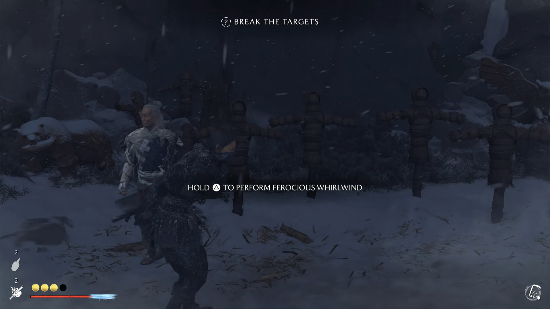 Break the straw training targets. This usually requires two phases: standard strikes first, then a second test where you must use the Kusarigama’s special “whirlwind” or charged sweep to destroy targets in succession. Focus on rhythm: charged attack to break the target, then follow-up light attacks if needed.