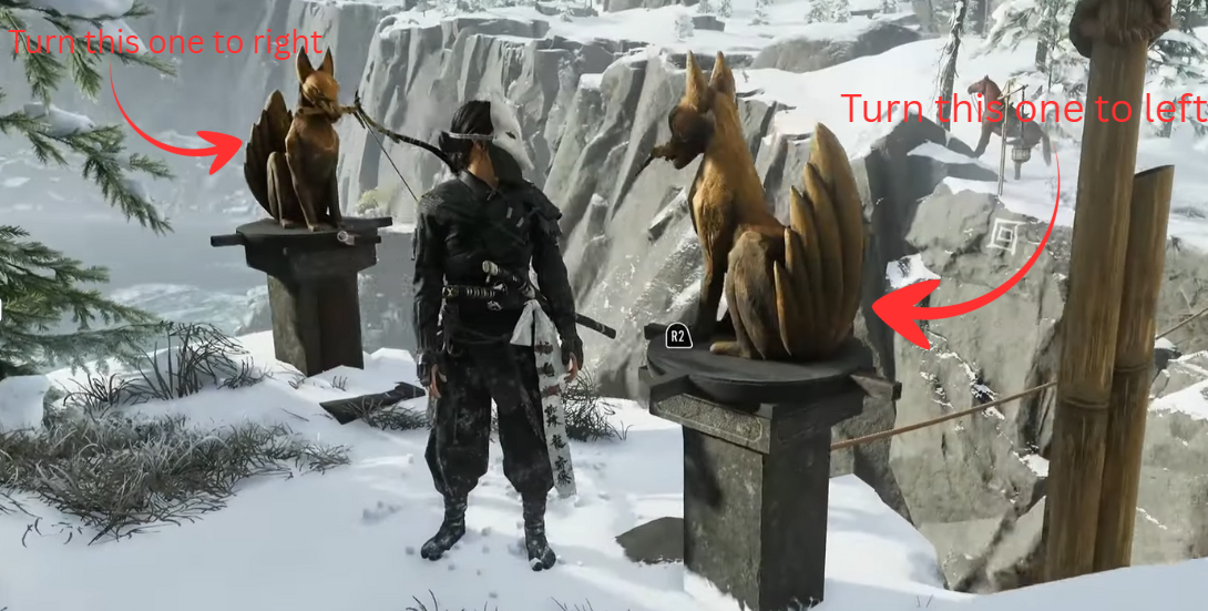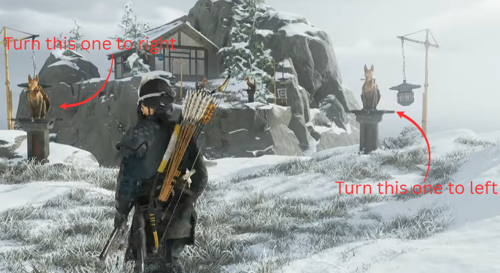 Near the shore, you will find two fox statues facing each other roughly. You need to rotate the left statue to face right and the right statue to face left.