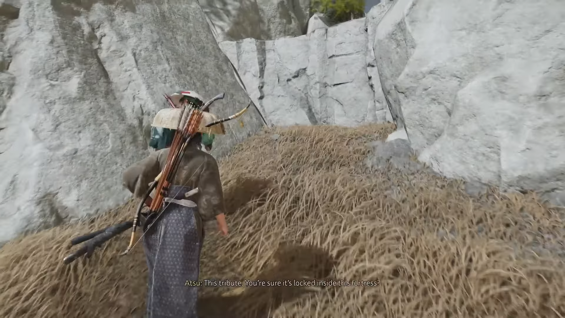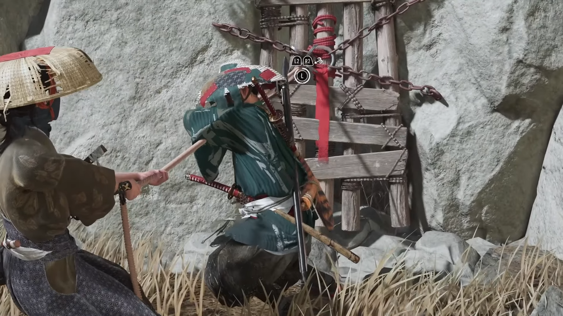 During the ascent, you’ll notice a destructible wall. Use your grappling hook to pull it down — this creates the hidden entrance into Jigoku Fortress.