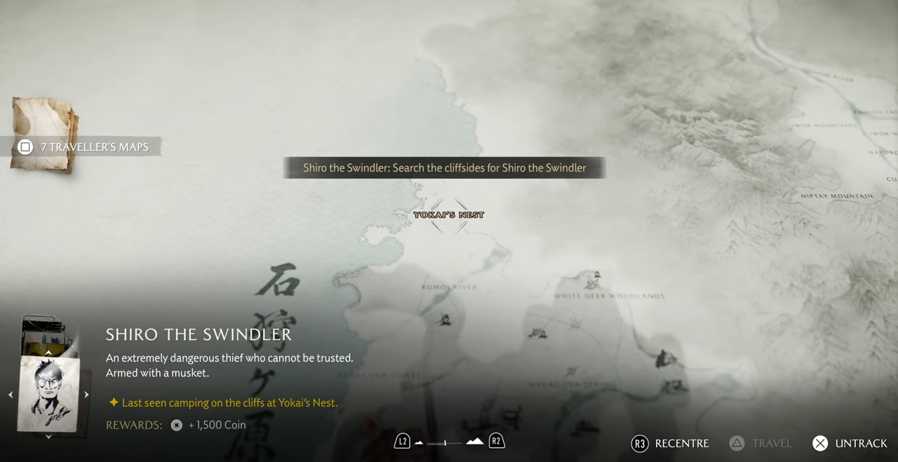 Ghost of Yōtei’s Shiro the Swindler bounty is short but pivotal. It unlocks access to the heavily guarded Jigoku Fortress and pays out unique cosmetics and coin rewards.