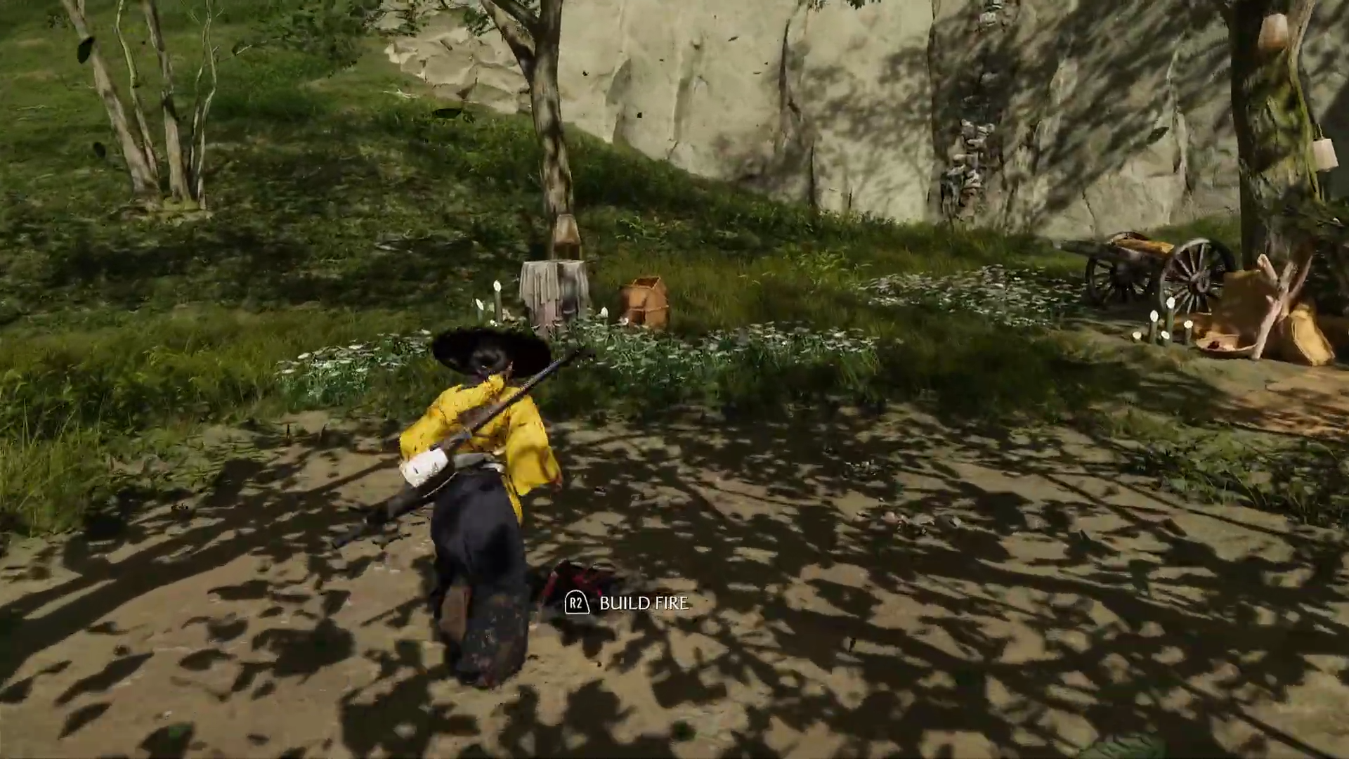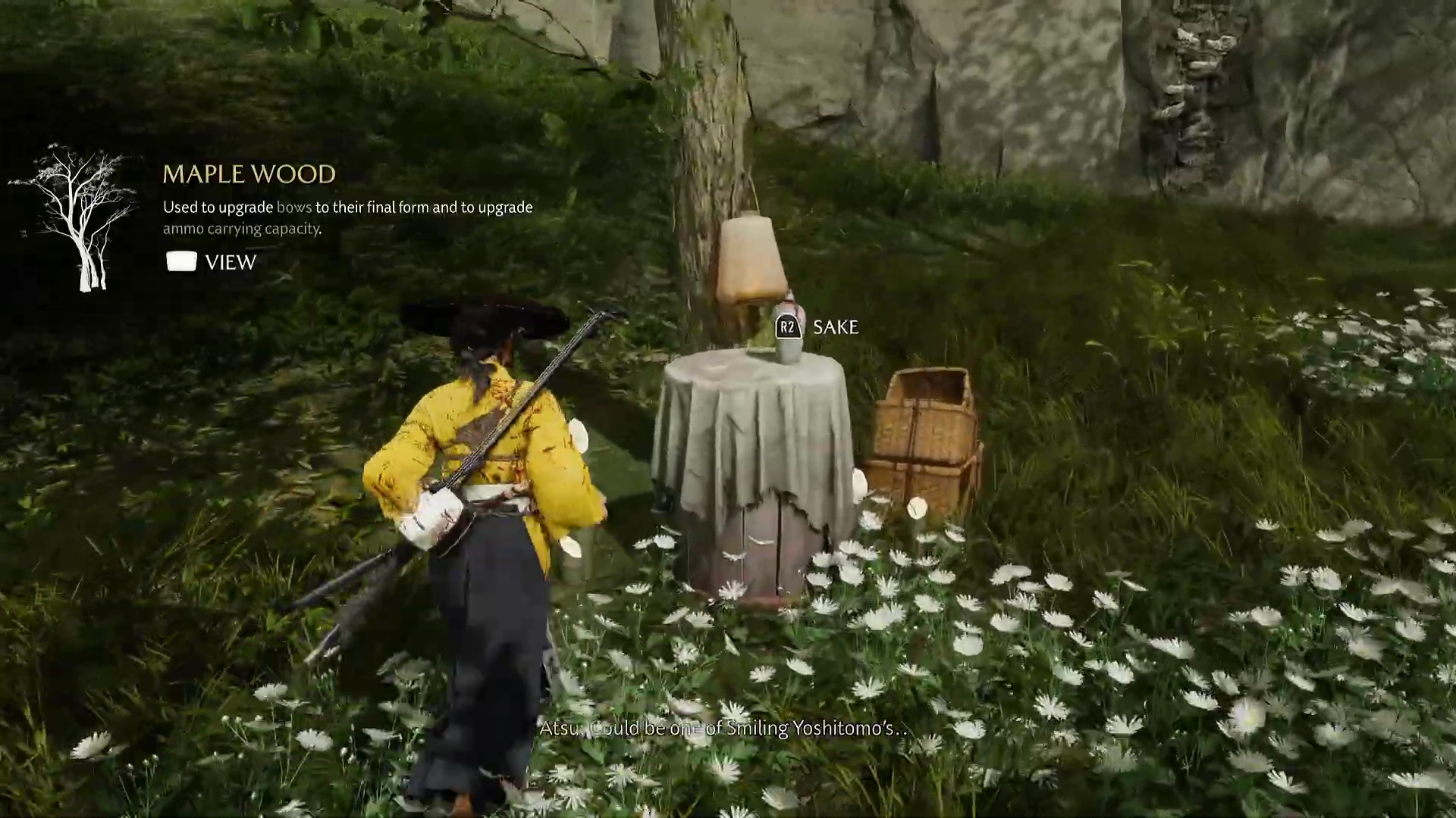 After building a campfire at Weary Traveler’s Camp, a white-robed settler will appear. After a brief dialogue, he reveals himself as Smiling Yoshitomo and attacks, which will begin the fight.