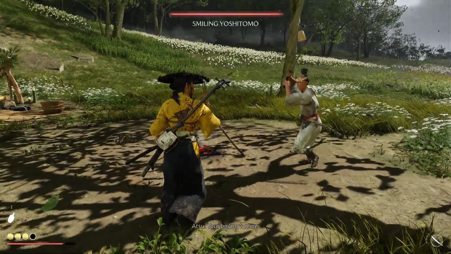 Smiling Yoshitomo doesn’t come with large reinforcements, making the duel manageable. He relies on quick strikes, so parries and dodges are especially effective. Once he is defeated, loot his body to secure the bounty proof.