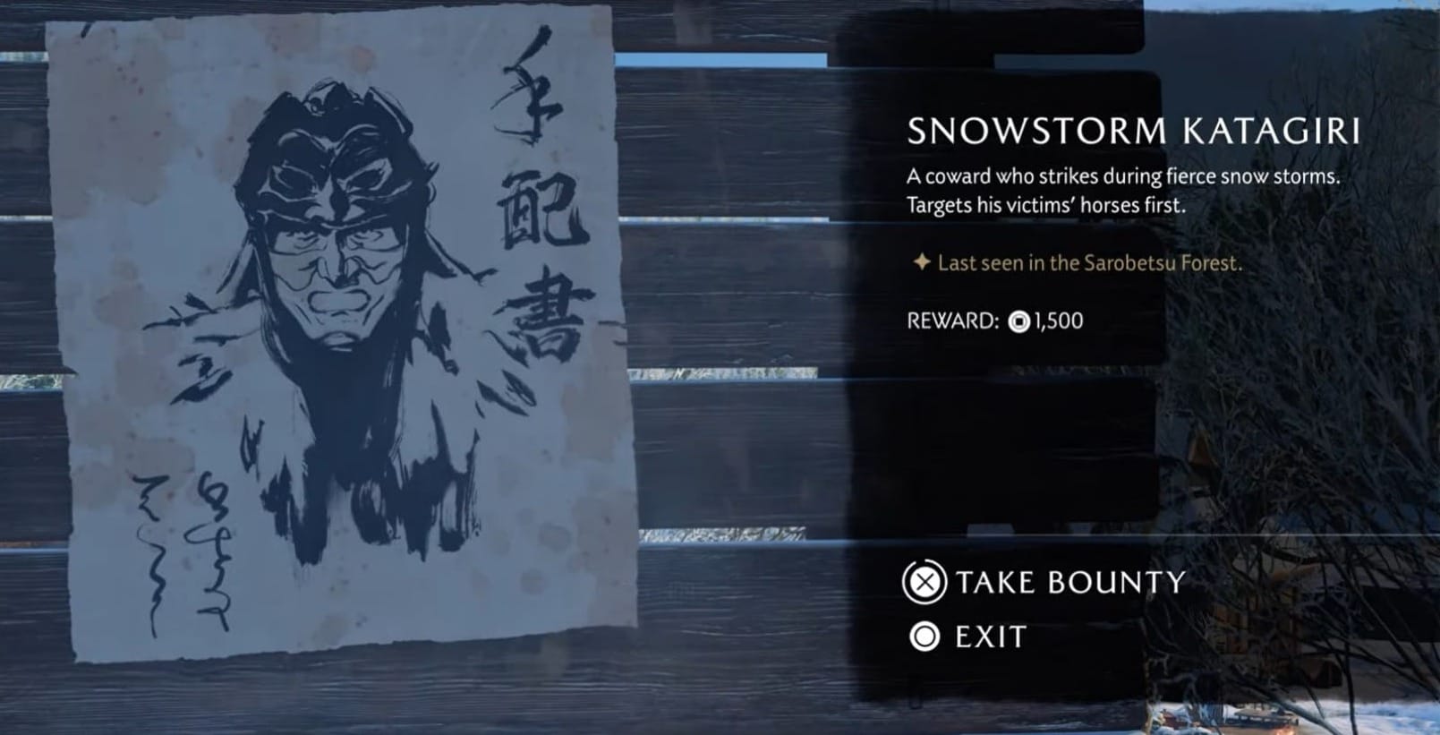 | Reward | 1,500 Coins — one of the higher-value bounties in Ghost of Yōtei. |