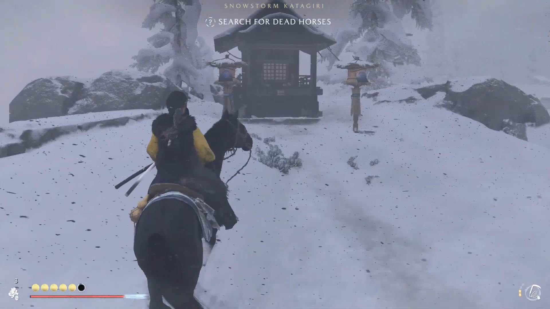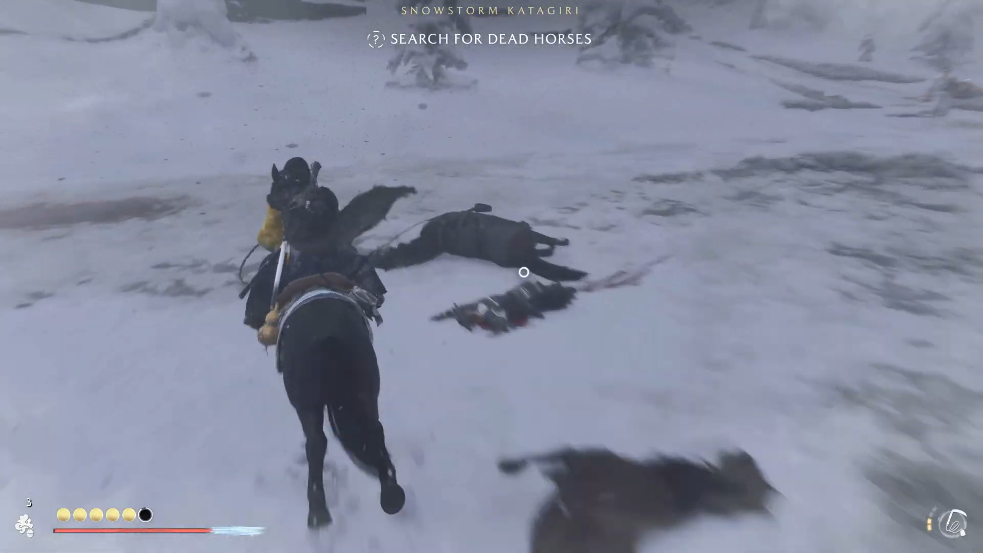 Head east from the Kitsune Altar to spot a trail of dead horses, signaling Katagiri is near.