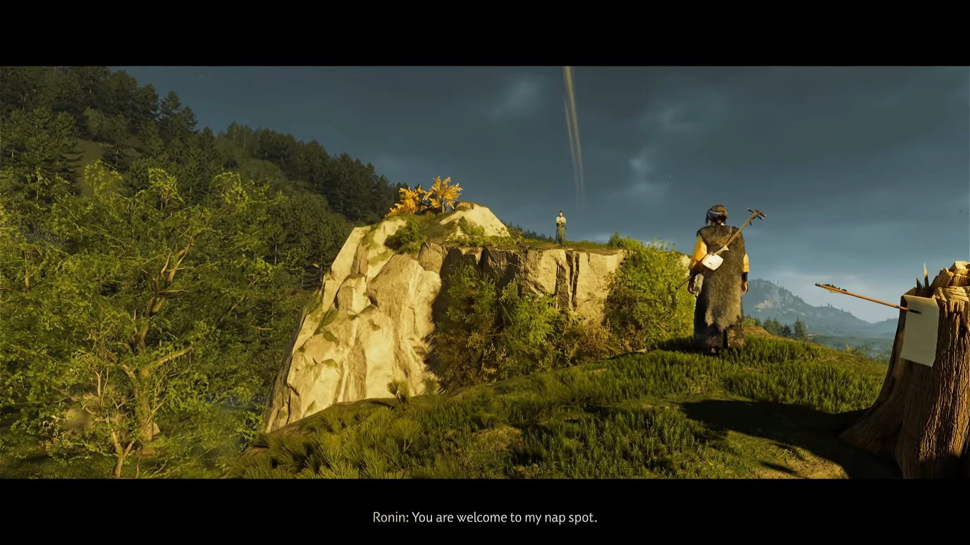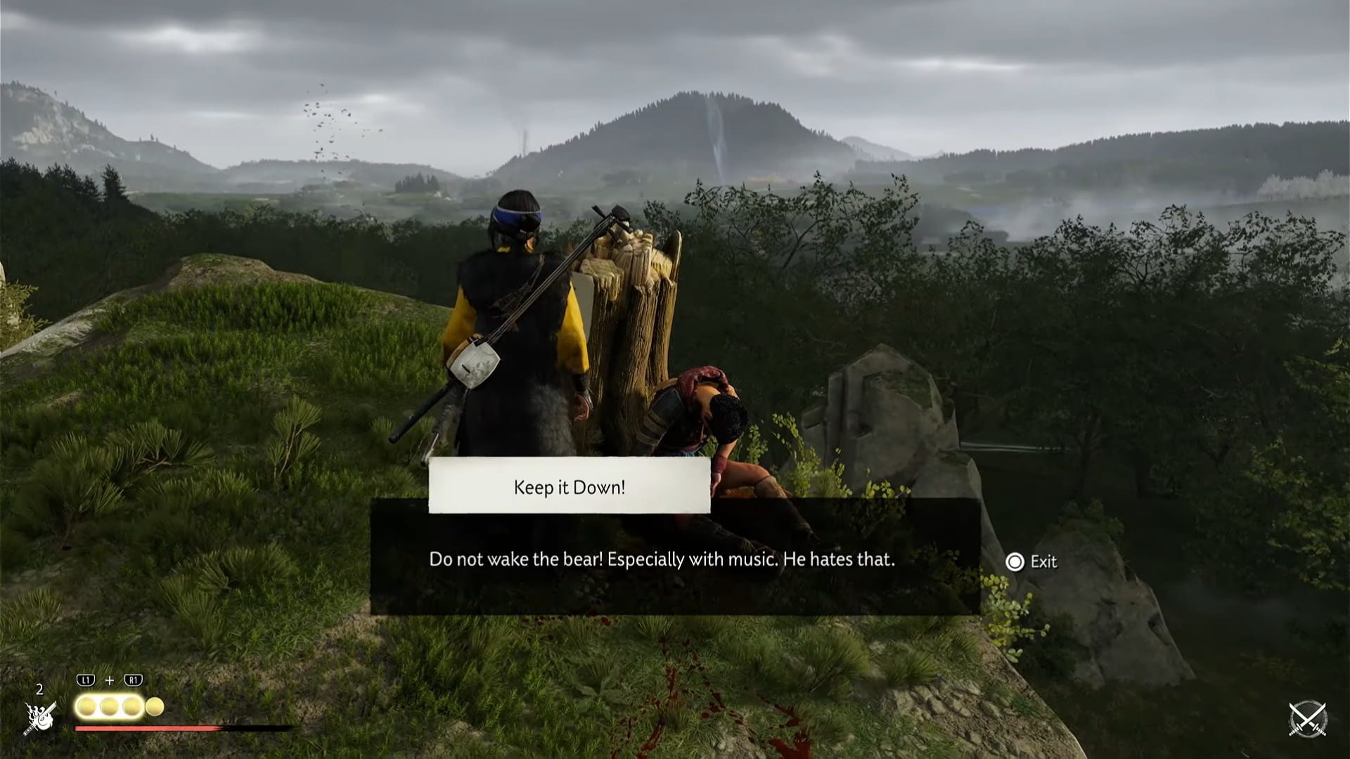 Play any song from your repertoire. This action triggers a small event: a disguised “bear”—actually a ronin—wakes up offended by your music.