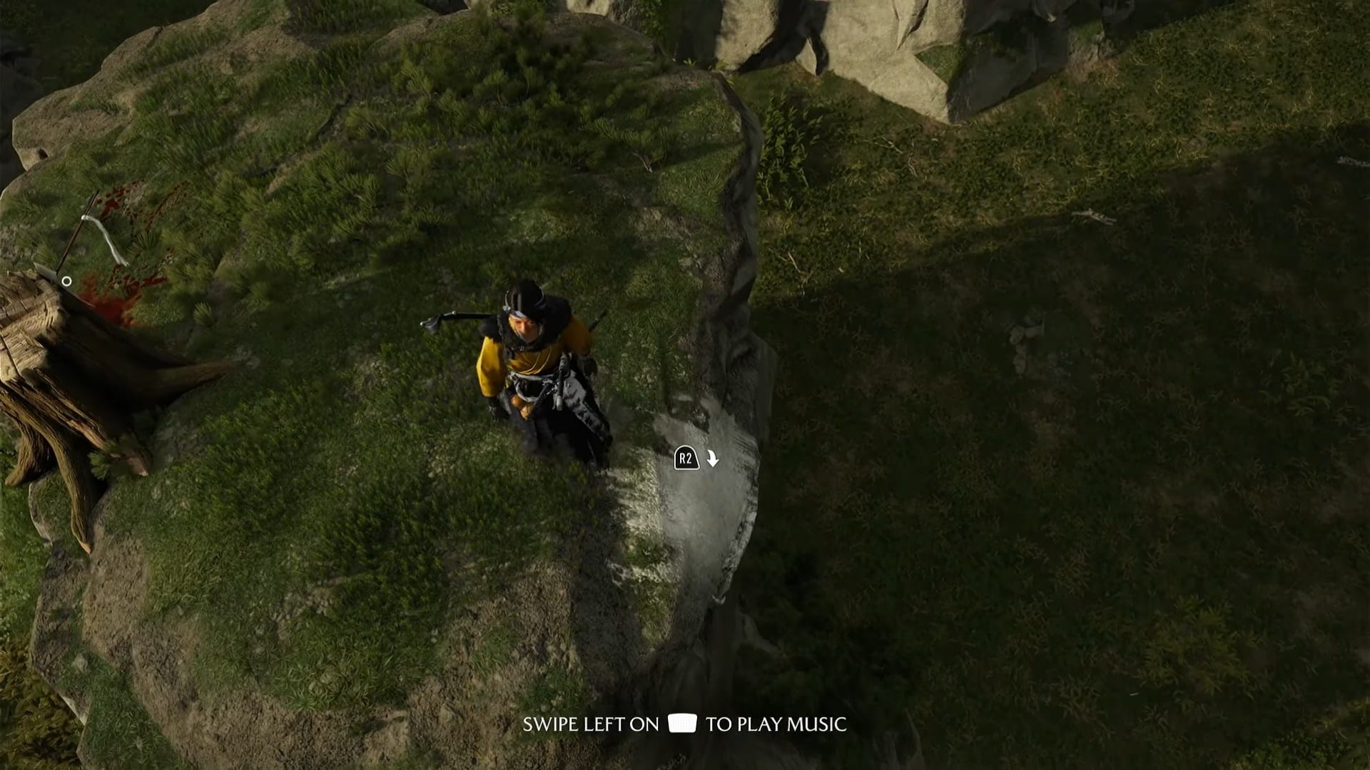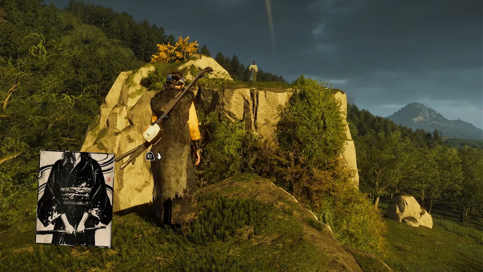 The key to progress is climbing the nearby, smaller stone tower just left of the main spire. Traverse three ledges to reach the top, where a corpse marks something important. Inspect the area for a note pinned to a stump, warning not to “wake the bear,” especially with music.