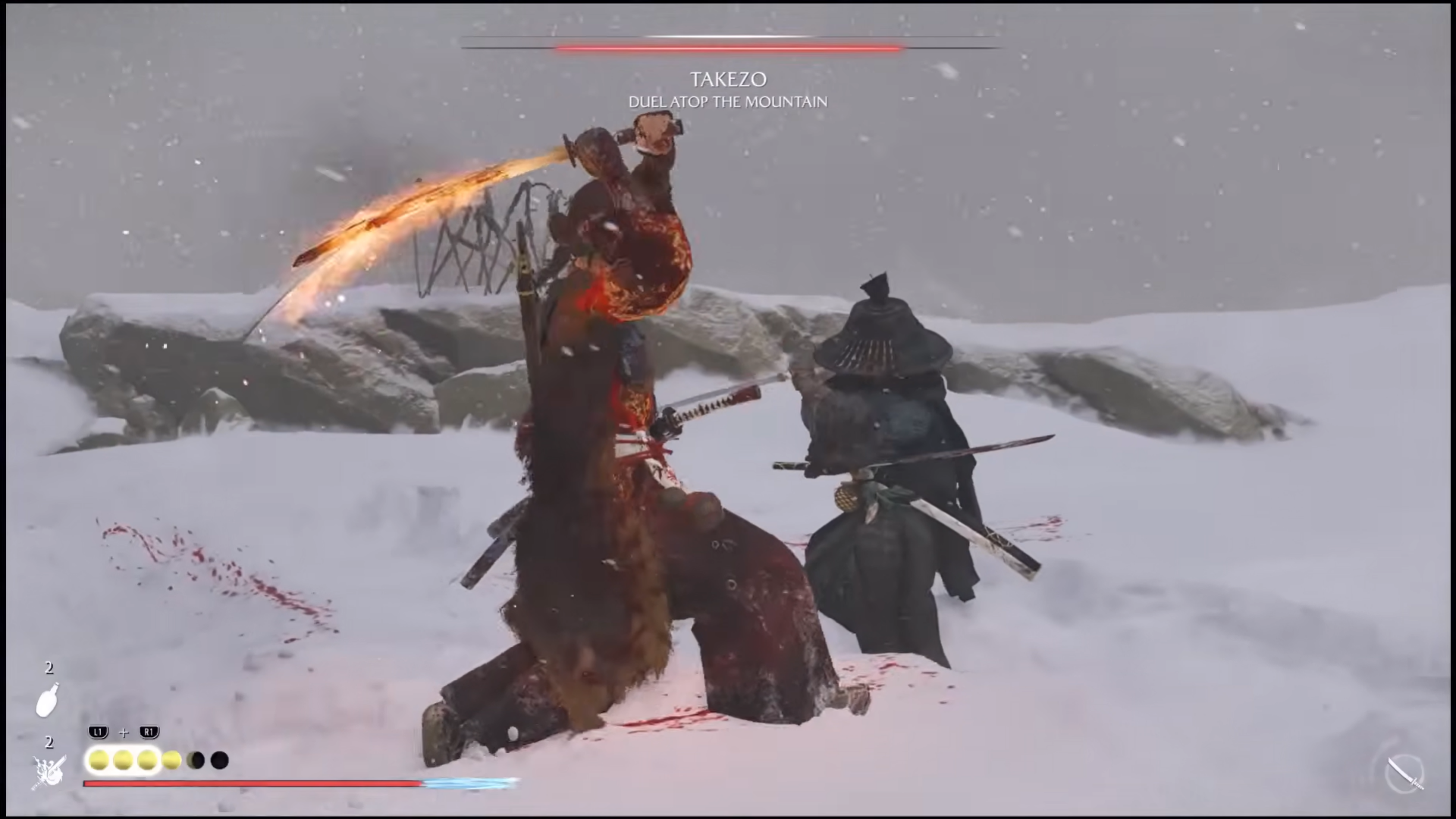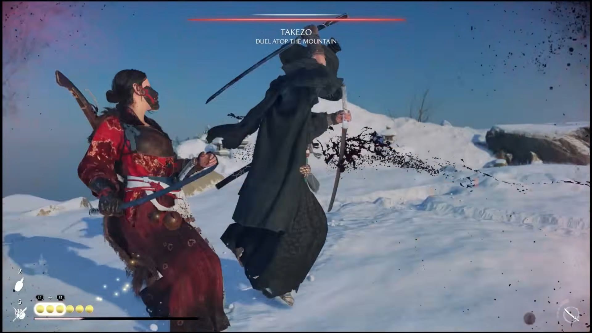 During the blizzard, health will progressively freeze and reduce. Finish the fight quickly by maximizing damage during safe windows. Use spirit to revive yourself if necessary, and make every opportunity count. Defeat Takezo.