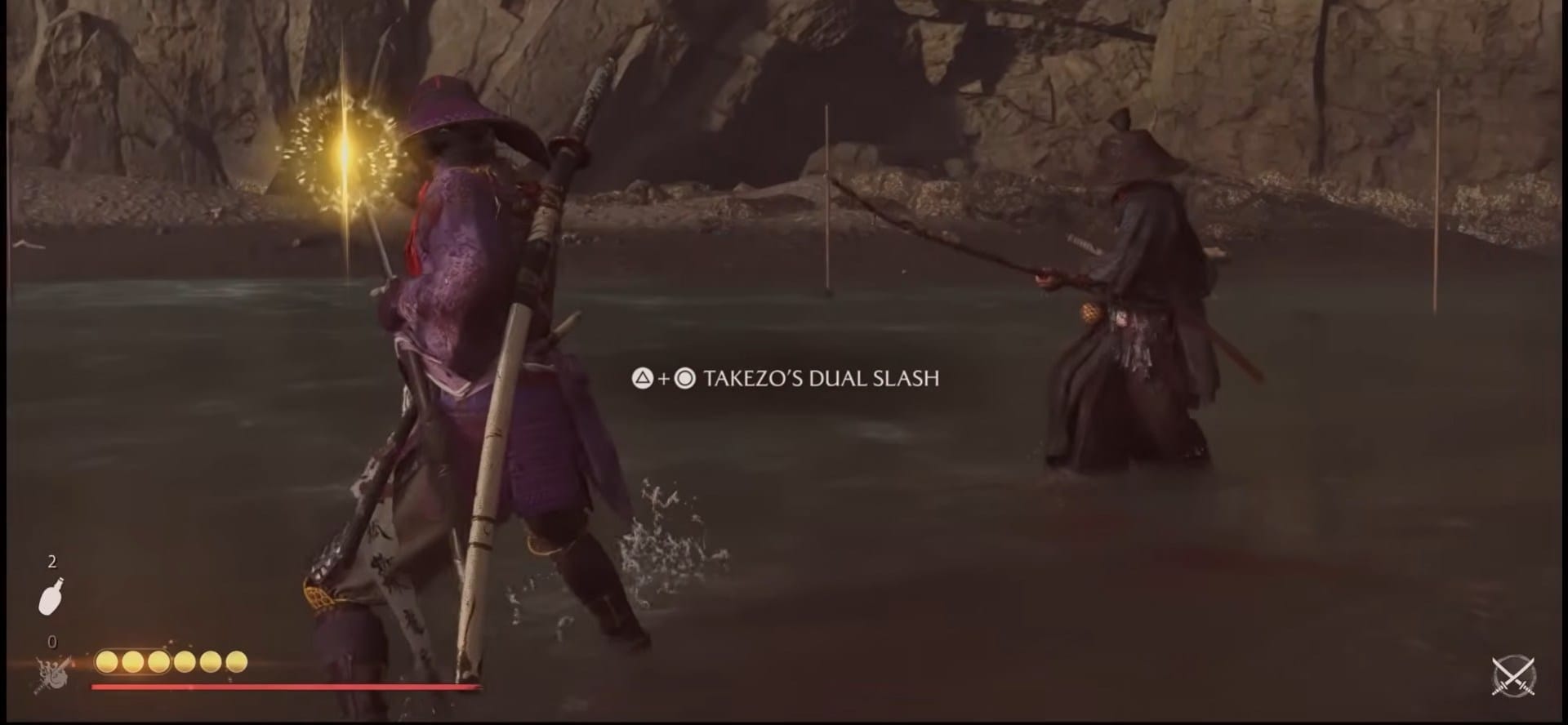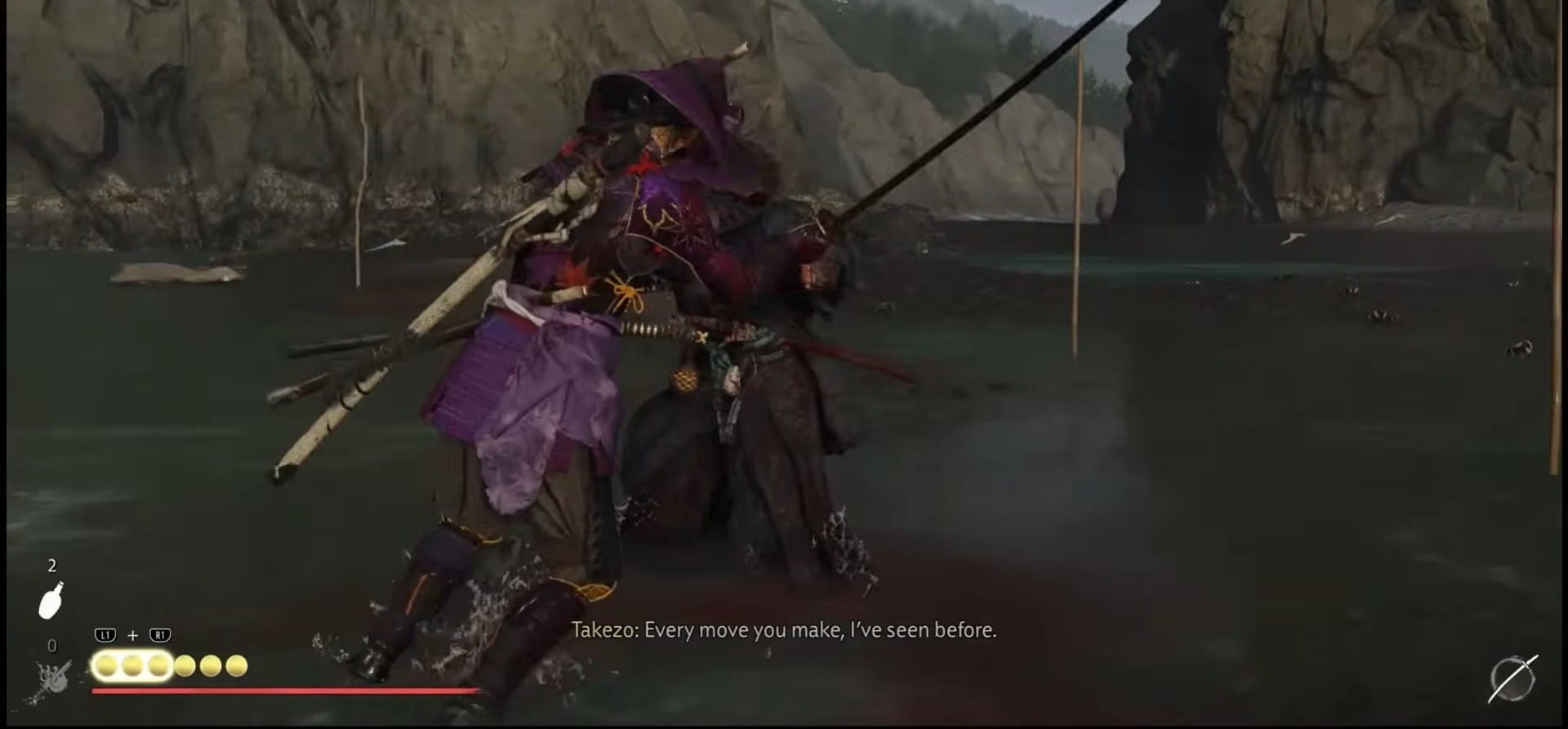 Dodge Takezo’s fast disarming strike at the end of his combo. Parrying or perfect parrying won’t succeed here—rely on dodges instead.