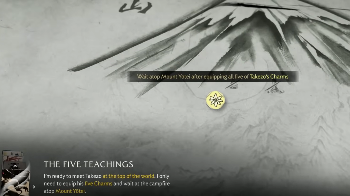 Once prepared, travel to the peak of Mount Yotei and interact with Takezo for your final challenge.
